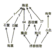 (2)下图表示一生态系统中生物种类间的相互关系。图中各种类均生活在退潮后暴露出的岩石上,其中海藻、藤壶、贻贝和海葵固着于岩石表面,海星、石鳖和石械则在岩石表面来回爬动找寻食物。图中的数字表示海星食物中各种类所占的比例(%)。