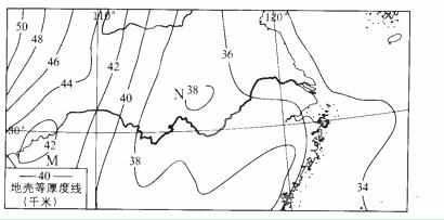 读“我国大陆部分地壳等厚度线图”,完成3~4题。