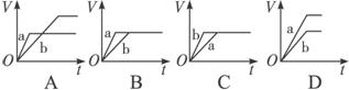 将等质量的两份锌粉a、b分别加入过量的稀硫酸中,同时向a中加入少量硫酸铜溶液,下列各图产生H2的体积V(L)与时间t(min)的关系中正确的是