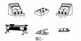 B.根据以上的数据及闭合电路欧姆定律,建立方程组,即可求出电源的电动势E与内阻r.该方程组的表达式是:_________________、____________________.该实验小组现在手头只有一个电流表,只知其内阻很小,却不知具体阻值。为了测出该电流表的内阻,她们找来了如图乙所示两节干电池等实验器材。请你用笔画线将图中的实物连接成能测出电流表内阻的电路,滑动变阻器串联接入电路起限流作用。