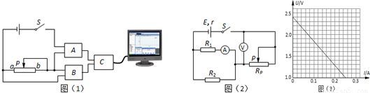 (1)甲同学利用DIS实验系统进行测量,连接成如图(1)所示的电路。图中方框A是_____________传感器,方框B是_____________传感器。闭合电键前,滑动变阻器的滑动头P应位于_________端(选填“a”或“b”)。![]()