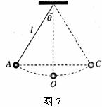 23. (9分) 如图7所示,把一个小球用细线悬挂起来,就成为一个摆, 摆长为l,最大偏角为θ。如果阻力可以忽略,小球运动到最低位置时的速度是多大?在最低点,细线的拉力为多大?
