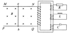 与导轨接触良好。N、Q端接理想变压器的初级线圈,理想变压器的输出端有三组次级线圈,分别接有电阻元件R、电感元件L和电容元件C。在水平金属导轨之间加竖直向下的匀强磁场,若用