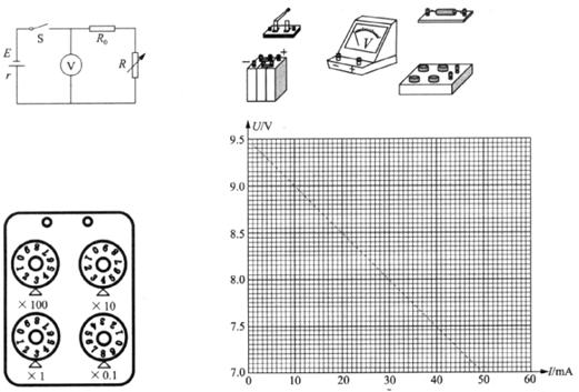 ,允许的最大输出电流为50mA。为了较准确的测量这个电池的电动势和内阻,可以设计出如下图所示的实验电路,已知实验中所使用的电压表内阻足够大,可以忽略其对电路的影响;图中R为电阻箱,阻值范围为0~999.9