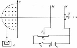 轴进入右侧的平行板电容器,并打到置于N板的荧光屏上。调节滑动触头,当触头P位于滑动变阻器的中央位置时,通过显微镜头Q看到屏上的亮点恰好能消失。已知电源电动势E,内阻为
