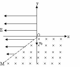 25、(20分)在xOy平面内,第III象限内的直线OM是电场与磁场的边界,OM与负x轴成450角,在x<0且OM的左侧空间存在着负x方向的匀强电场E=0.32N/C,在y<0且OM的右侧空间存在着垂直纸面向里的匀强磁场B=0.1T,如图,不计重力的带负电的微粒,从坐标原点O沿y轴负方向以