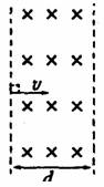 18.垂直于纸面的匀强磁场区域宽度为d,一个电子以速度v沿图示方向垂直磁场方向及磁场边界射入该区域,恰好不能飞过场区。采取如下哪些方法,可能使该电子飞到场区右侧 ( )