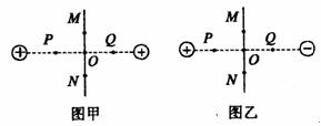 21.甲乙两图分别表示两个等量正电荷和两个等量异号电荷的电场,O为两电荷连线的中点,P、Q是连线上关于O对称的两点,M、N为连线中垂线上关于O对称的两点,若带电量为-q的粒子在电气中仅受电场力作用,则 ( )