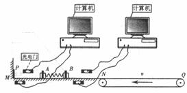 24.(16分)如图所示,为光电计时器的实验简易示意图。当有不透光物体从光电门问通过时,光电计时器就可以显示物体的挡光时间。光滑水平导轨MN上放置两个相同的物块A和B,左端挡板处有一弹射装置P,右端N处与水平传送带平滑连接,今将挡光效果好,宽度为d=3.6×10
