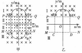 m处有两个与z轴平行的水平界面PQ和MN把空间分成I、Ⅱ、Ⅲ三个区域,在三个区域中分别存在匀强磁场B1、B2、B3其大小满足B2=B1=2B3=0.02T,方向如图甲所示。在Ⅱ区域中的y轴左右两侧还分别存在匀强电场E1、E2(图中未画出),忽略所有电磁场的边缘效应。ABCD是以坐标原点。为中心对称的正方形,其边长L=0.