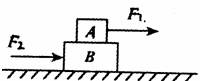 14.如下图所示,质量相等的两物体A、B叠放在粗糙的水平面上,A与B接触面光滑。A受水平恒力F1,B受水平恒力F2,F1与F2方向都向右,且F2>F1。若物体A和B保持相对静止,则物体B受到的摩擦力大小和方向应为