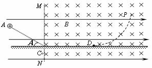 14.(16分)如下图,空间内存在水平向右的匀强电场,在虚线MN的右侧有垂直纸面向里、磁感应强度为B的匀强磁场,一质量为m、带电荷量为+q的小颗粒自A点由静止开始运动,刚好沿直线运动至光滑绝缘的水平面C点,与水平面碰撞的瞬间小颗粒的竖直分速度立即减为零,而水平分速度不变,小颗粒运动至D处刚好离开水平面,然后沿图示曲线DP轨运动,AC与水平面夹角α = 30°,重力加速度为g,