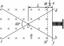 15.(16分)如下图所示,光滑金属导体ab和cd水平固定,相交于O点并接触良好,∠aOc=60°.一根轻弹簧一端固定,另一端连接一质量为m的导体棒ef,ef与ab和cd接触良好.弹簧的轴线与∠bOd平分线重合.虚线MN是磁感应强度大小为B、方向竖直向下的匀强磁场的边界线,距O点距离为L.ab、cd、ef单位长度的电阻均为r.现将弹簧压缩,t =