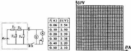 (2)(12分)下图虚线方框内是由电阻、电源组成的线性网络电路,为了研究它的输出特性,将电流表、电压表、滑动变阻器按图示的方式连接在它的输出端A、B之间。开关S闭合后,实验中记录的6组电流表示数I、电压表示数U如下图所示。
