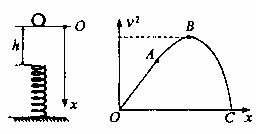 21.如图所示,劲度系数为k的轻弹簧竖直放置,下端固定在水平地面上,一质量为m的小球,从离弹簧上端高h处自由释放,压上弹簧后继续向下运动的过程中。若以小球开始下落的位置为原点,沿竖直向下建立坐标轴ox,则小球的速度平方v2随坐标x的变化图象如图所示,其中OA段为直线,AB段是与OA相切于A点的曲线,BC是平滑的曲线,关于A、B、C各点对应的位置坐标xA、xB、xC及加速度aA、aB、aC的判断正确的是( )