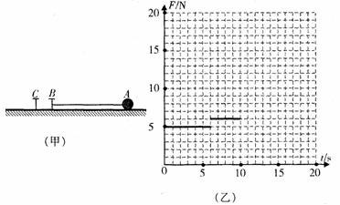 20.(17分)如下图(甲)所示,在光滑水平地面上固定B、C两个钉子,足够长的细线一端拴在B钉上,另一端系一小球A;拉直细线使A、B、C在同一直线上,现给A球一个垂直于AB方向的水平初速度,使小球在水平地面上做圆周运动,运动过程中细线与钉子相碰时没有能量损失.从小球刚运动时开始计时,在0≤t<10s时间内细线拉力F大小的变化图线如下图(乙)所示.试通过分析与计算,在图(乙)中作出在10s≤t≤20s时间内细线拉力F大小的变化图线(设细线在运动过程中没有被拉断).