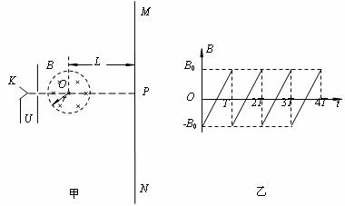 24.(18分)电视机显像管中需要用变化的磁场来控制电子束的偏转。图甲为显像管工作原理示意图,阴极K发射的电子束(初速不计)经电压为U的电场加速后,进入一圆形匀强磁场区,磁场方向垂直于圆面(以垂直圆面向里为正方向),磁场区的中心为O,半径为r,荧光屏MN到磁场区中心O的距离为L。当不加磁场时,电子束将通过O点垂直打到屏幕的中心P点。当磁场的磁感应强度随时间按图乙所示的规律变化时,在荧光屏上得到一条长为