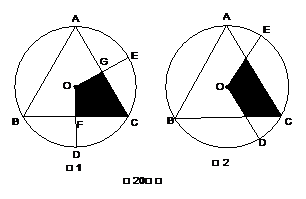 20、09年第20题:(1)如图1,圆内接△ABC中,AB=BC=CA,OD、OE为⊙O的半径,OD⊥BC于点F,OE⊥AC于点G,求证:阴影部分四边形OFCG的面积是△ABC的面积的