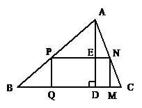 (满分10分)在△ABC中,AD⊥BC于D,BC=12,AD=9,矩形PQMN内接于△ABC,且PN=2PQ,求矩形PQMN的面积。