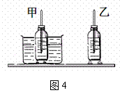 小明注意到妈妈是把饭菜放在空气中冷却的,而厨房中适合用来冷却的另一种物质就是水.水和空气哪个的导热性能好呢?为此小明用两个相同的牛奶瓶,都装入热牛奶,一个放在温度与室温相同的水中,另一个就放在空气中,为了尽量减少其他因素的影响,他把两个瓶都用木块垫起来,放在同一个桌面上.如图4所示.实验时他每隔一定的时间记录一次甲、乙两温度计的示数,得到的数据如下表: