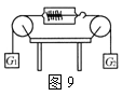 17.图9所示,一只重力可忽略不计的弹簧测力计水平放置,通过两只滑轮在两端悬挂质量为500g的物体各一个,则测力计的示数为 N,测力计受到的拉力的合力是 N.