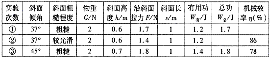 39. (09·宁夏)针对“斜面的倾斜程度与斜面的机械效率有怎样的关系?”这个问题,某同学利用同一木板,搭成不同倾角的斜面,将同一小车沿斜面匀速拉动,记录实验数据如下表。
