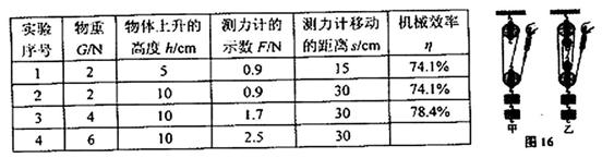 30.(09·厦门)小明在“测滑轮组机械效率”的实验中,用如图16甲所示的滑轮组进行实验,实验数据如下表: