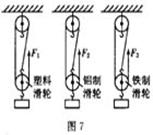 16、(10·长春)(4分)在“探究影响滑轮组机械效率的因素”实验中,小红用如图7所示的滑轮组分别做了三次实验,第一次使用塑料滑轮,第二次使用铝制滑轮,第三次使用铁制滑轮,实验数据记录如下表: