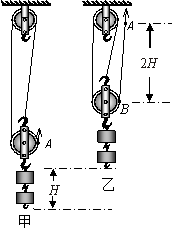 16.(江西)在测“滑轮组机械效率”的实验中,瑞瑞同学在与动滑轮相切的细绳上作一标记A(如图甲所示),然后用大小为F的拉力匀速竖直向上提升总重为G的钩码.当钩码上升的高度为H时,瑞瑞同学在与动滑轮相切的细绳上作另一标记B,并测得AB两点间的距离为2H(如图乙所示).(不计摩擦与绳重)