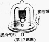 17.将电铃扣在抽气盘上的玻璃钟罩内,如图所示。通电后可以看到电铃在振动,听到电铃发出的声音。用抽气机向外抽气的过程中,仍可清晰地看到电铃在振动,但铃声越来越小。对以上现象的解释,下列说法错误的是