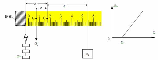 36.(11·黄石)(三)杆秤也是一种常见的称量工具。该兴趣小组为了研究杆秤的刻度是否均匀,取一把刻度尺和一些已知质量的钩码来研究。在刻度尺最左端加上配重,刻度尺和配重的总重力为G0,它们的重心C位于提钮O左边L0处,如左图所示,用质量为m1的钩码做秤陀,用质量不计的细绳和小铁钩在提钮O左边L1处做一秤钩。现逐次增加秤钩处的钩码,调节秤陀的位置,使刻度尺保持平衡,记录下每次平衡时秤钩处的钩码质量mx与秤砣离提钮O的距离x,以x为横坐标,以mx为纵坐标,作出了如右图所示的图线,其中x0是直线与x轴的交点。