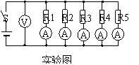 把已知阻值的电阻按实验图连接电路,闭合开关,测出电压表和各个电流表示数,根据公式P=IU分别计算出电阻R1、R2、R3、R4、R5的功率P1、P2、P3、P4、P5 ,比较P1×R1、P2 ×R2、P3× R3 、P4 ×R4 、P5× R5,若乘积相等,说明在电压相等的条件下,电功率与电阻成反比。……1分