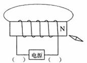 18.(11·上海)根据下图中通电螺线管的N圾,标出磁感线方向、小磁针的N极,并在括号内标出电源的正、负极。