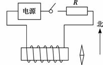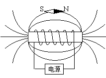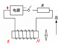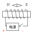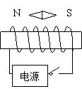 35.(2012乐山)小红设计了如下图所示判断电源两极的方法:在螺线管附近放一可以自由转动的小磁针,静止时的指向如图所示;闭合开关,小磁针指南的一端向西偏转。请在图上标出螺线管的南北极和电源的正负极。[
