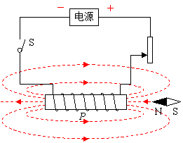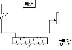 44.(2012潍坊)在一只硬纸筒上绕多匝漆包线,做成一个螺线管P,将它接入如图所示的电路中,再将小磁针放在螺线管附近,闭合开关后,小磁针静止时的指向如图中所示。请在图中标出电源的“+”、“-”极,并画出螺线管周围磁感线的分布情况(画出5条线)