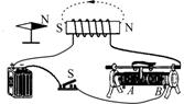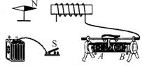 49.(2012资阳)根据图中小磁针静止时的指向,用笔划线代替导线将如图所示的实物连线图补充完整(要求:①小磁针的指向满足如图所示方向;②滑动变阻器的滑片向A端移动时通电螺线管的磁性减弱);标出通电螺线管的N、S极并画出它的一条磁感线,在磁感线上标明磁场方向。