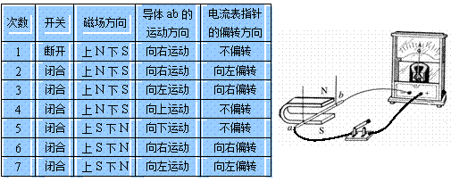 竖直上下移动ab,指针不发生偏转;左右移动ab,指针发生偏转;左右加快移动ab,指针偏转幅度变大;换用磁性较大的磁铁.以同样速度左右移动ab,指针偏角更大;ab不动,左右移动磁铁,指针偏转;ab左右移动方向不同,指针偏转方向不同等。