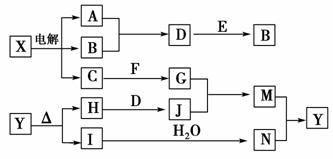 [解析] 解题的关键是利用物质的颜色进行突破。I为红棕色气体氧化物,一定是NO2;M为红褐色沉淀,一定是Fe(OH)3;F是地壳中含量最多的金属元素的单质,一定是Al;X电解生成三种物质,其中A、B是气态单质且能反应生成D,猜测是电解NaCl溶液,生成的H2和Cl2反应生成HCl,盐酸能与黑色固体E(氧化物)反应生成气体B,则E应是MnO2,B是Cl2,则A是H2。NO2和H2O反应生成HNO3(N),HNO3和Fe(OH)3反应生成Fe(NO3)3(Y),Fe(NO3)3可分解生成Fe2O3(H),Fe2O3与HCl反应生成FeCl3(J),NaOH(C)与Al反应生成NaAlO2(G),Fe3+和AlO可以发生双水解反应生成Fe(OH)3(M)。