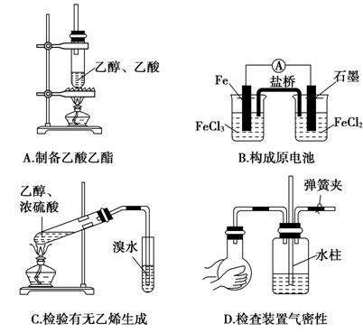 [解析] A项,缺少浓硫酸,试管可直接加热且试管应倾斜45°;B项,两池中电解质溶液应互换;C项,反应产生的SO2气体也能使溴水褪色,故不能检验是否有乙烯产生。