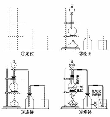 在绘制化学实验装置图时,要能体现所有的各种仪器和连接部件组装正确,布局合理,使用科学。在同一图形中,各种仪器的绘制线条粗细应一致,画面要洁净,并能清楚地反映出各种仪器的特征形象。