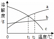 D.降温至t1℃, 三种溶液中溶质的质量分数一定a=c>b