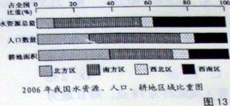 读图13“2006年我国水资源、人口、耕地区域比重图”,完成27—28题。