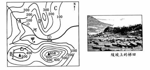 (2)该地区最高海拔为___ __米, 甲乙两地的最小高差接近_____米。图上测得甲、乙