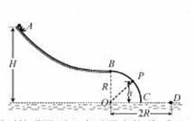 图为某游乐场内水上滑梯轨道示意图,整个轨道在同一竖直平面内,表面粗糙的AB段对到与四分之一光滑圆弧轨道BC在B点水平相切。点A距水面的高度为H,圆弧轨道BC的半径为R,圆心O恰在水面。一质量为m的游客(视为质点)可从轨道AB的任意位置滑下,不计空气阻力。