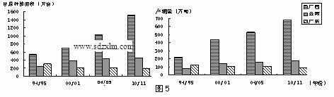 图5为我国三省区甘蔗种植面积与产量变动状况图。读图回答11~12题。