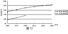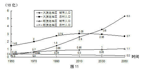 37.(20分)图11是1950~2050年世界上较发达地区和欠发达地区城市人口与农村人口变化趋势示意图。据图回答问题。