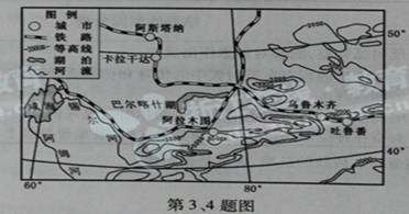 中亚位于“丝绸之路经济带”的中部,中亚国家与我国之间已形成由铁路、公路、航空和管道等多种交通运输方式构成的综合运输体系。读我国与中亚部分地区略图,完成第3、4题。