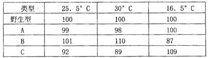 II、果蝇的自然群体中,第II号染色体的变异很多。下表表示果蝇的三种第II号染色体突变类型(A、B、C)在不同温度下的存活能力与野生型果蝇的比较(以野生型为100)