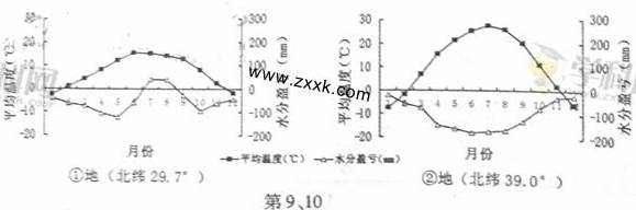 水分盈亏量是降水量减去蒸发量的差值,反映气候的干湿状况。当水分盈亏量>0时,表示水分有盈余,气候湿润;当水分盈亏量<0时,表示水分有亏缺,气候干燥。下图为我国两地年内平均水分盈亏和湿度曲线图。读图,完成第9、10题。