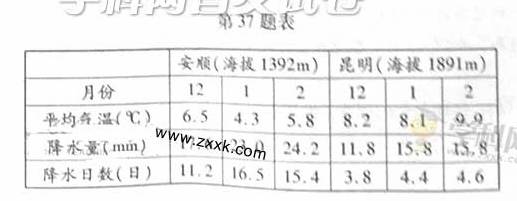 (3)安顺和昆明位于准静止锋两侧,比较两地冬季气候差异,并解释其原因。(12分)